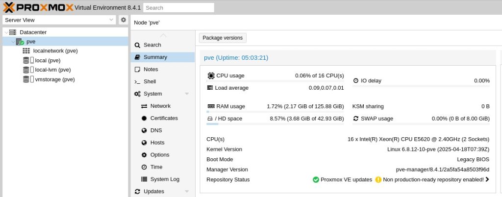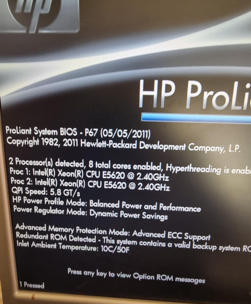 Kriittiset speksit ovat 2 x Intel Xeon E5620 2.40Ghz, valtavasti Ethernet- ja kuituporttejakin, 2 x 146 ja 6 x 300 GB SAS-levyt ja mikä parasta 128GB työmuistia. Tähän piti nyt sitten saada Proxmox 8.4.1 asennettua kun semmoisella hypervisorilla on instituutissa jo pitkään menty, ja edellinen pikkuruinen Proliant tuleekin päätymään Proxmox Backup – palvelimeksi. Mutta se asentaminen ei ollutkaan ihan pikkujuttu, kuten olin jo ammoin ehtinyt unohtaa. HP-raudassa on omat kommervenkkinsä!